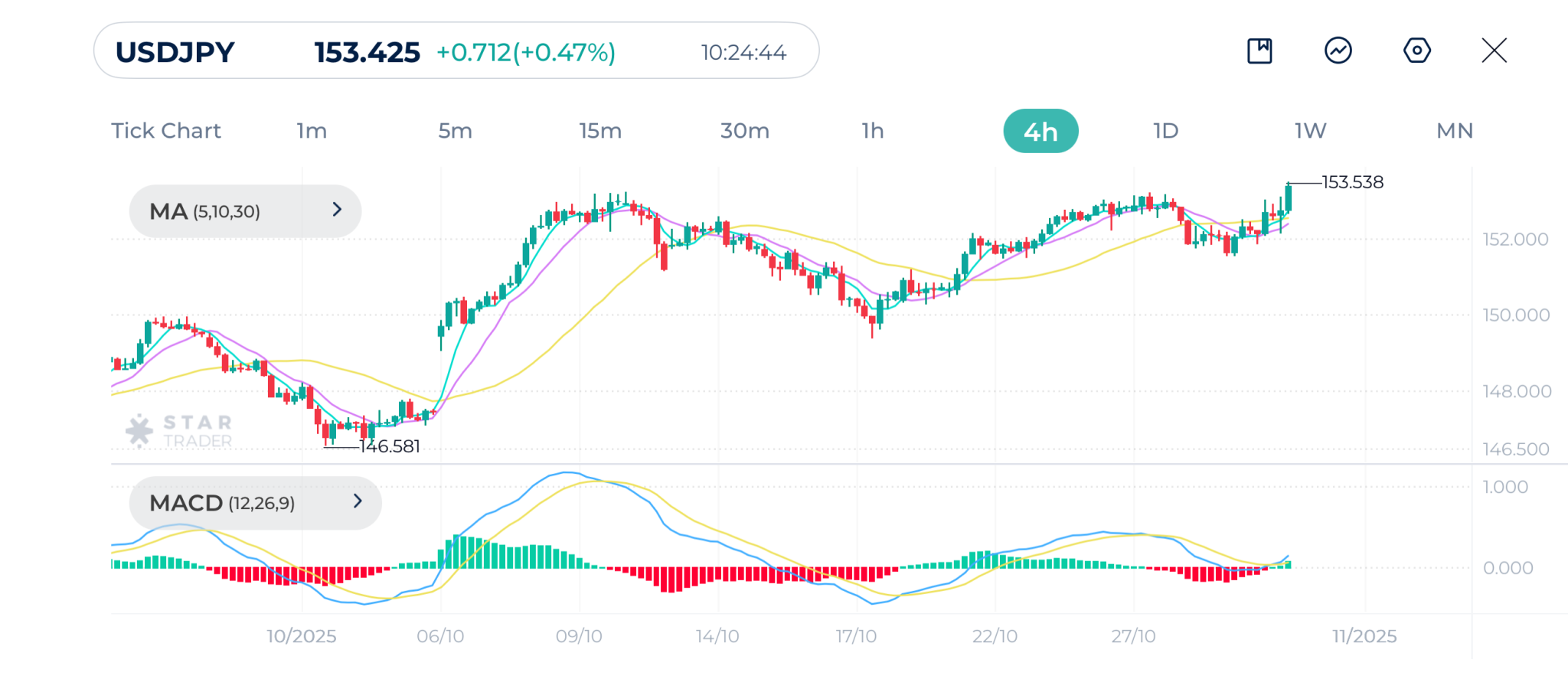The 4-hour chart of USDJPY shows a strong uptrend over the past few weeks. As it has been steadily rising from a low around 146.58 in early October to its current level of 153.42. Price action shows strong green candlesticks with minor pullbacks, which is typical of a healthy, trending market. The overall trend remains bullish.