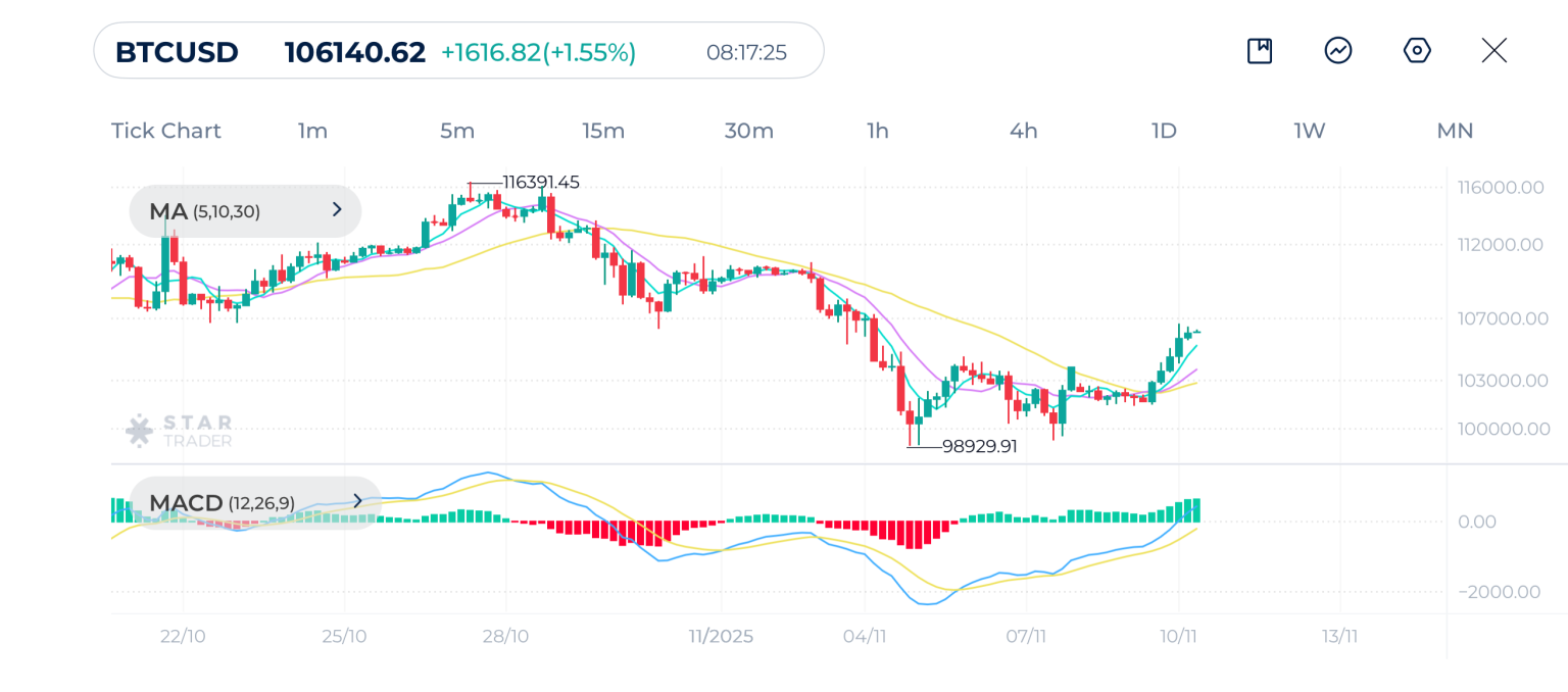 Bitcoin has shown strong recovery momentum after falling below $100,000 multiple times last week and bottoming near $98,900. The cryptocurrency bounced sharply, reclaiming key short-term moving averages. The crossover between the 5- and 10-period moving averages on the 4H chart reflects renewed buying pressure, with the price now attempting to stabilize above the $106,000 level.
