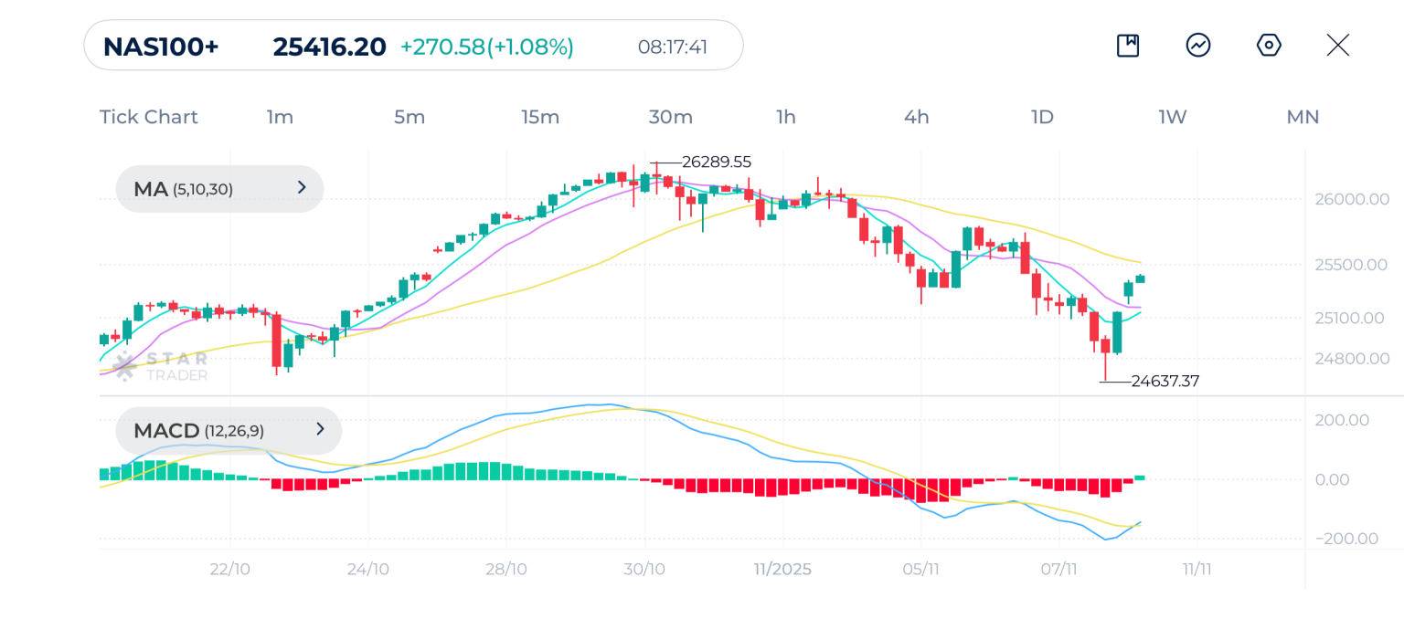 Nasdaq-100 shows a clear rebound from the recent low at 24,637, where the market found solid buying interest after a sharp downtrend on the 4H chart. The price has since moved higher, crossing above the short-term moving averages MA(5) and MA(10), signaling a potential shift in short-term momentum. However, the index remains below the 30-period moving average, suggesting that the overall trend may still be under bearish pressure unless further upside continuation confirms a reversal.
