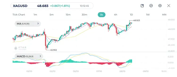 Silver has recently rebounded strongly from the $45.90 level, breaking above short-term moving averages MA(5) and MA(6) and now trading above the 30-period moving average, a sign of bullish momentum building up. The trend on the 1H chart appears to be in the early phase of a short-term uptrend continuation.