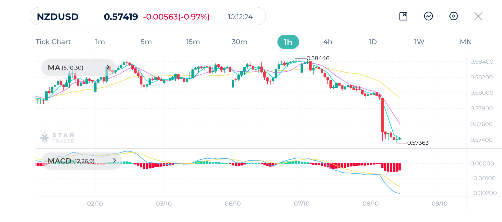NZDUSD has been in a steady downtrend after failing to hold above 0.5840. Price sharply dropped to 0.5736, forming a temporary base. All moving averages are sloping downward, confirming persistent bearish pressure.