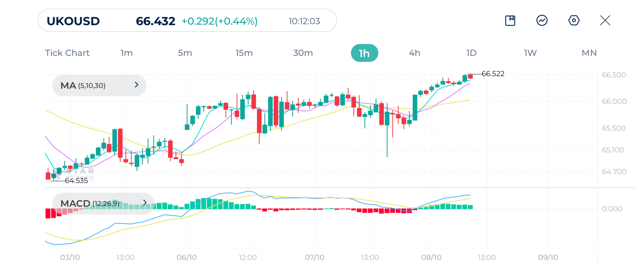 Brent has been in a mild uptrend after rebounding from the $64.53 zone. Price is trading above all three moving averages, suggesting a stable bullish bias. The structure shows higher lows and higher highs on the 1H chart.