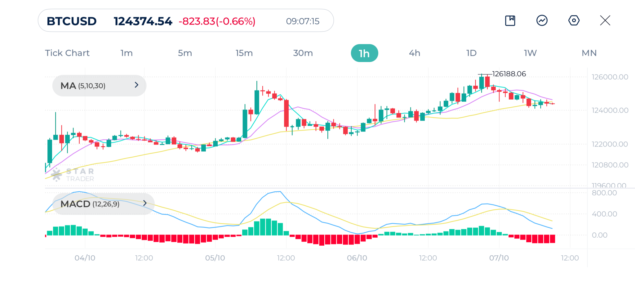 Bitcoin has seen a minor bearish correction on the hourly chart after peaking above $126,200 yesterday, and now showing signs of short-term consolidation. The 30-period MA acts as dynamic support, while the 5- and 10-period moving averages slope downward, signaling mild bearish momentum.