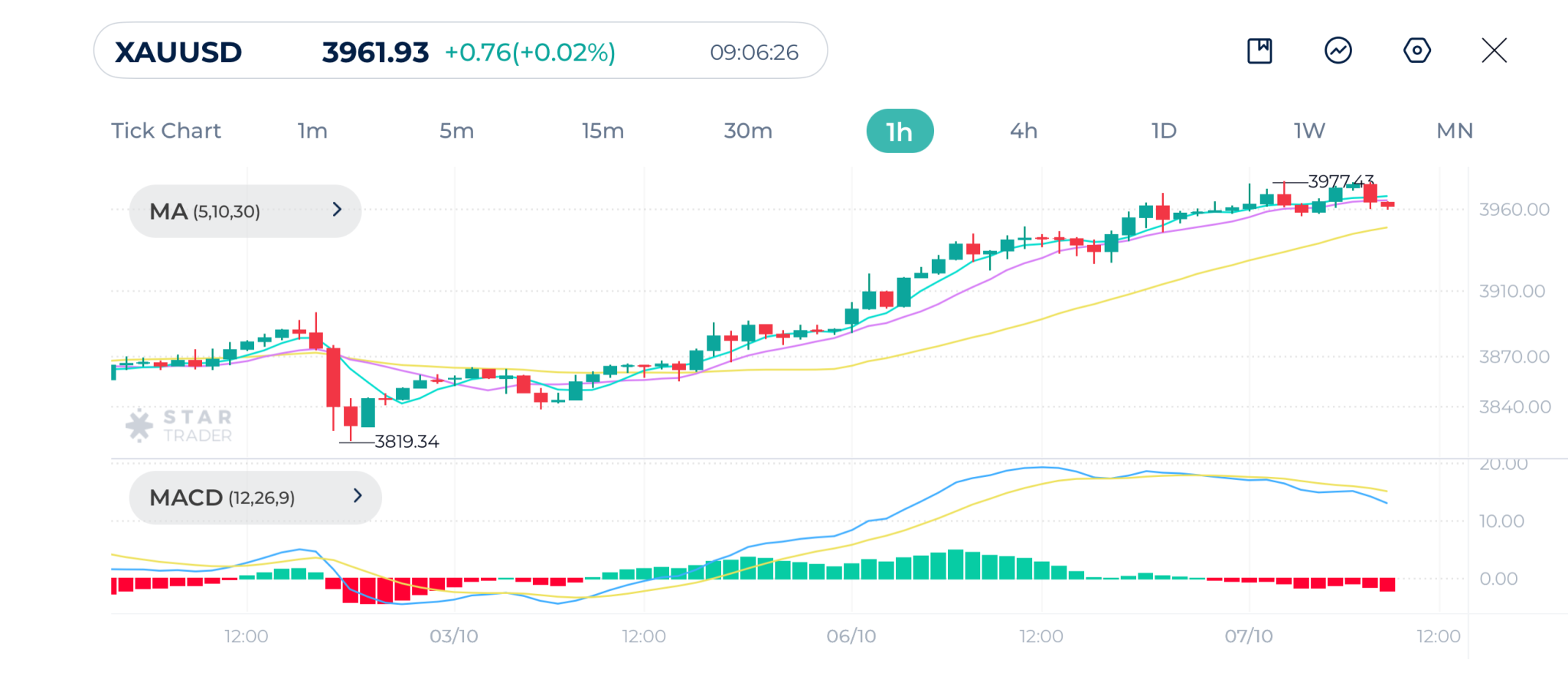 Gold continues to trade in a strong bullish structure, as it reached a new record high at $3,977 recently. Price remains above the 30-period moving average, and short-term MAs (5,10) are still above the 30 MA a sign of ongoing uptrend despite minor consolidation. The market is digesting gains near $3,960 after a sharp rise.