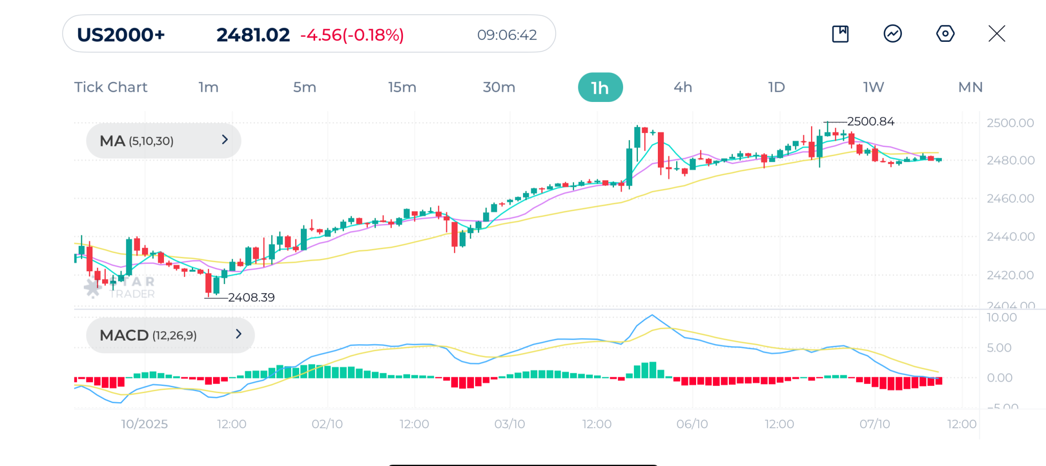 Russell 2000 may consolidate between 2,470–2,500. A sustained break above 2,505 could resume the uptrend, while a drop below 2,470 may invite deeper correction toward 2,450.