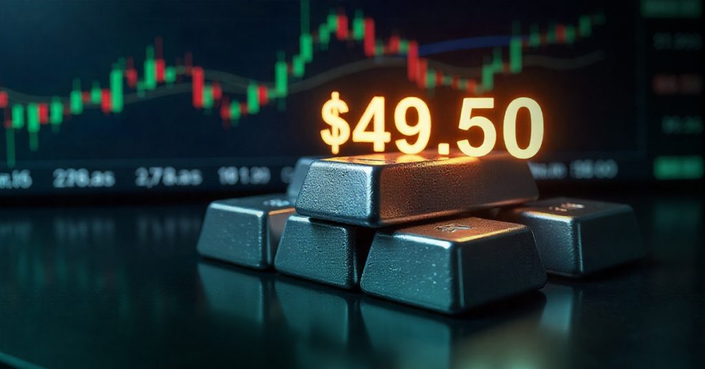 Silver shows a strong uptrend on the hourly chart as the precious metal nears its all-time high. Price has recently hit a high of $49.53 and is currently experiencing a slight pullback or consolidation just below this peak. The series of higher highs and higher lows confirms the bullish momentum.