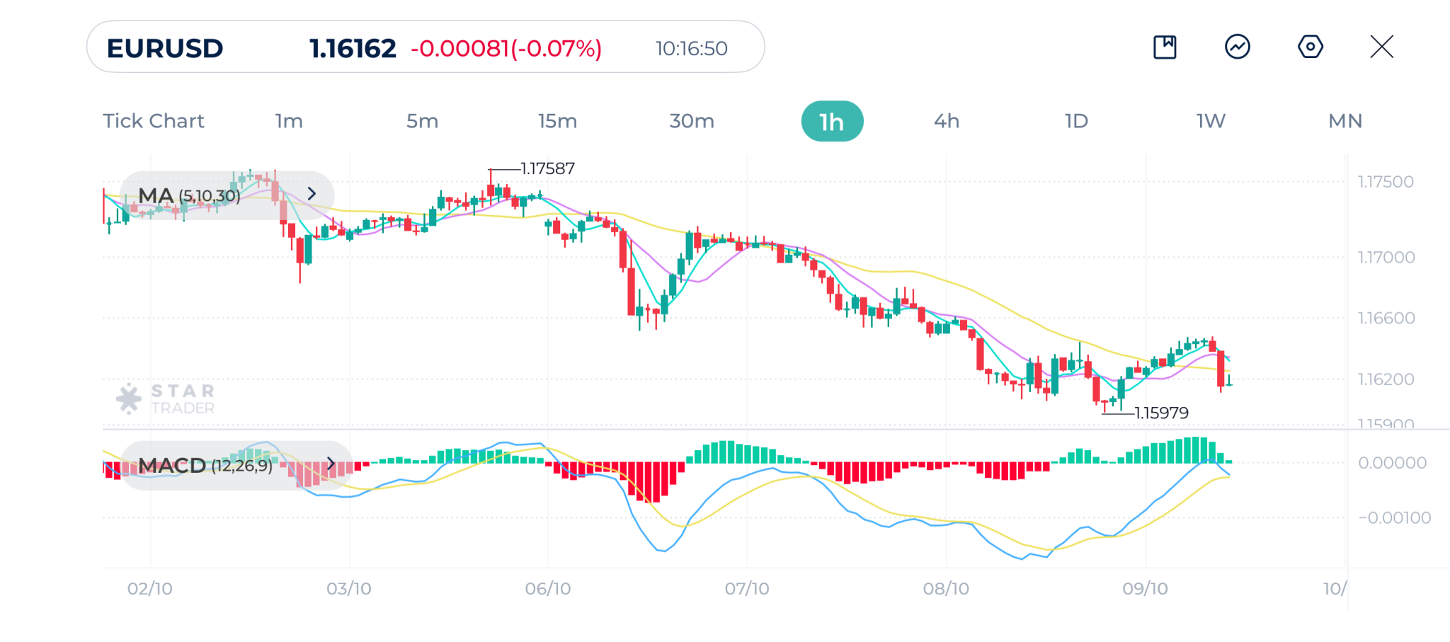 Recently, the MACD line has crossed above the Signal line, and the histogram bars have turned green, both occurring near the low of 1.15979.