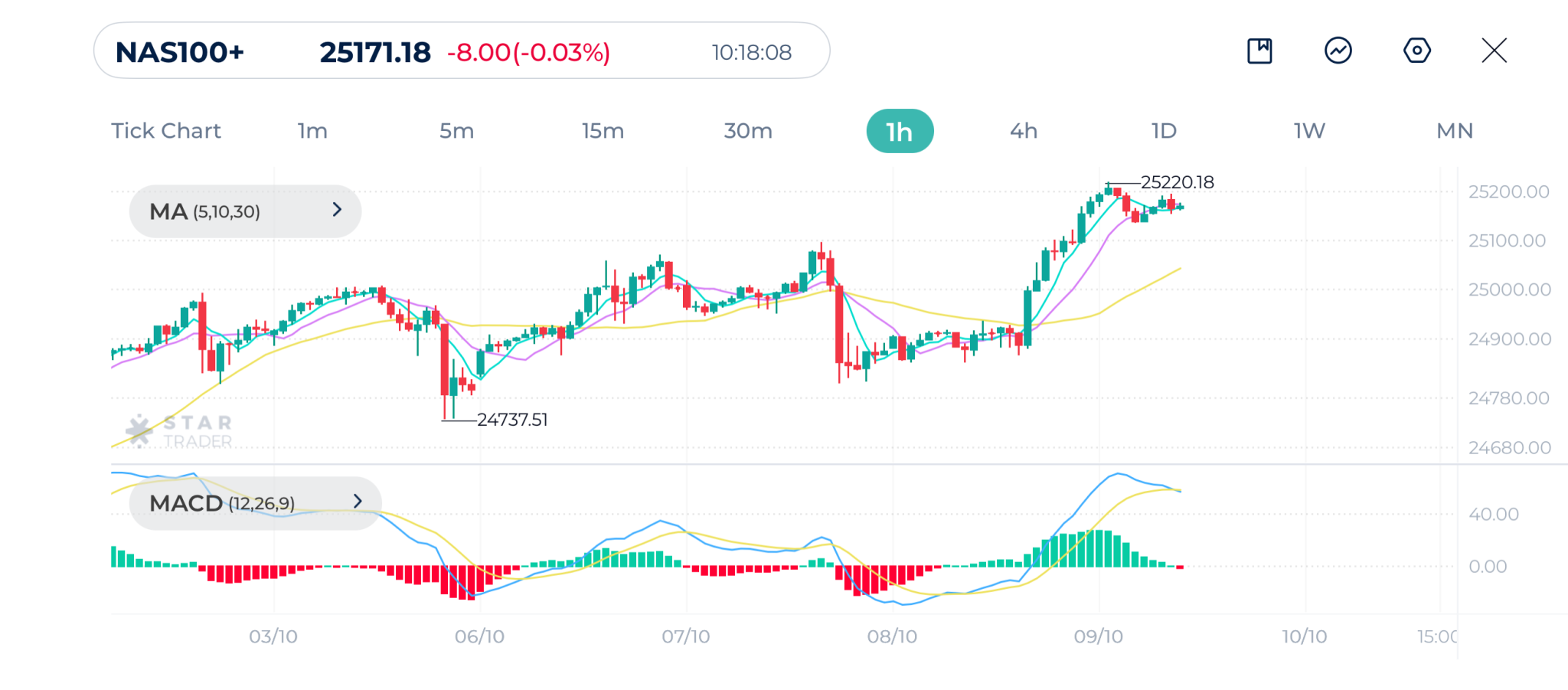 Nasdaq 100 shows a clear uptrend as it outperforms the other major US indices. The index peaked at 25,220.18 and is currently undergoing a minor retracement. The candles show a strong push up into a consolidation phase.