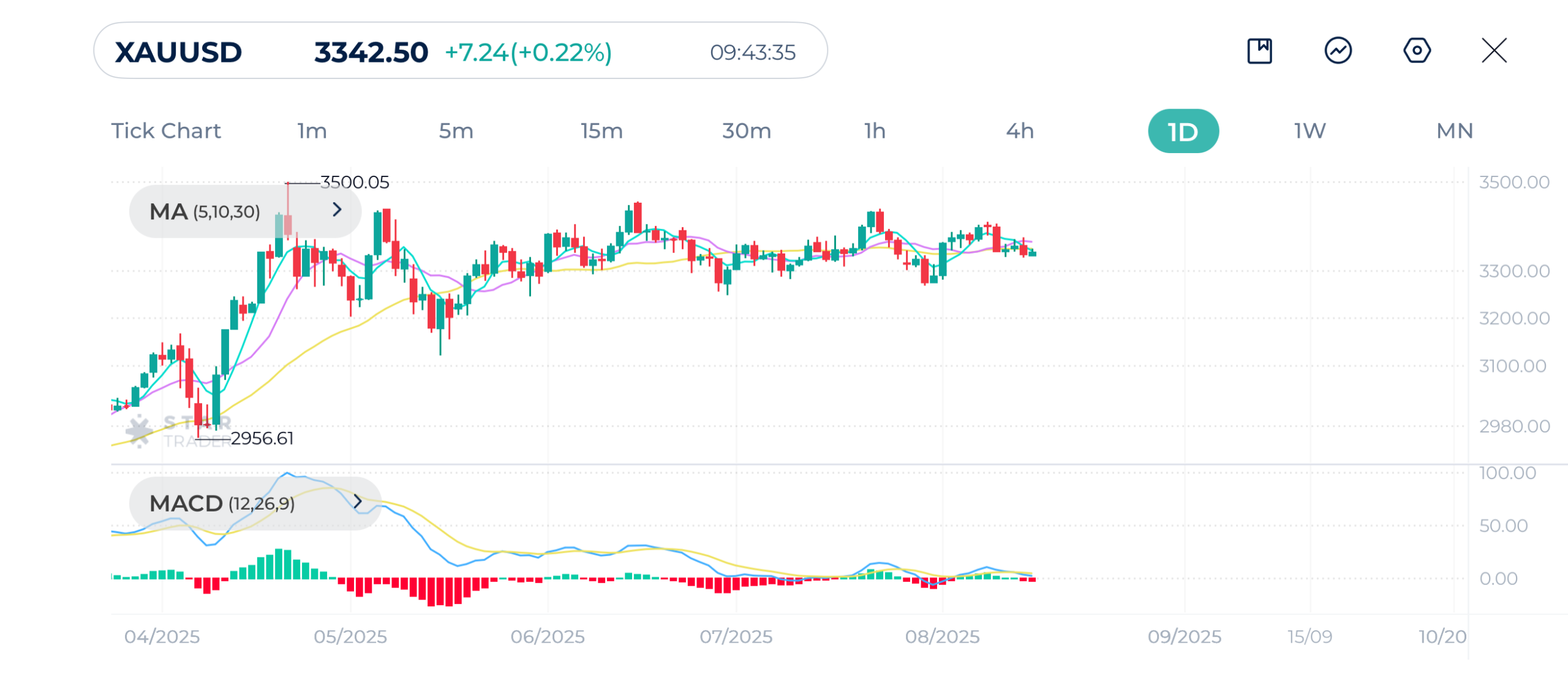 Gold (XAUUSD) continues to show sideways consolidation between near $3,400 levels, reflecting indecision in the market. The moving averages MA(5), MA(10), and MA(30) are moving sideways, signaling a pause in directional momentum.
