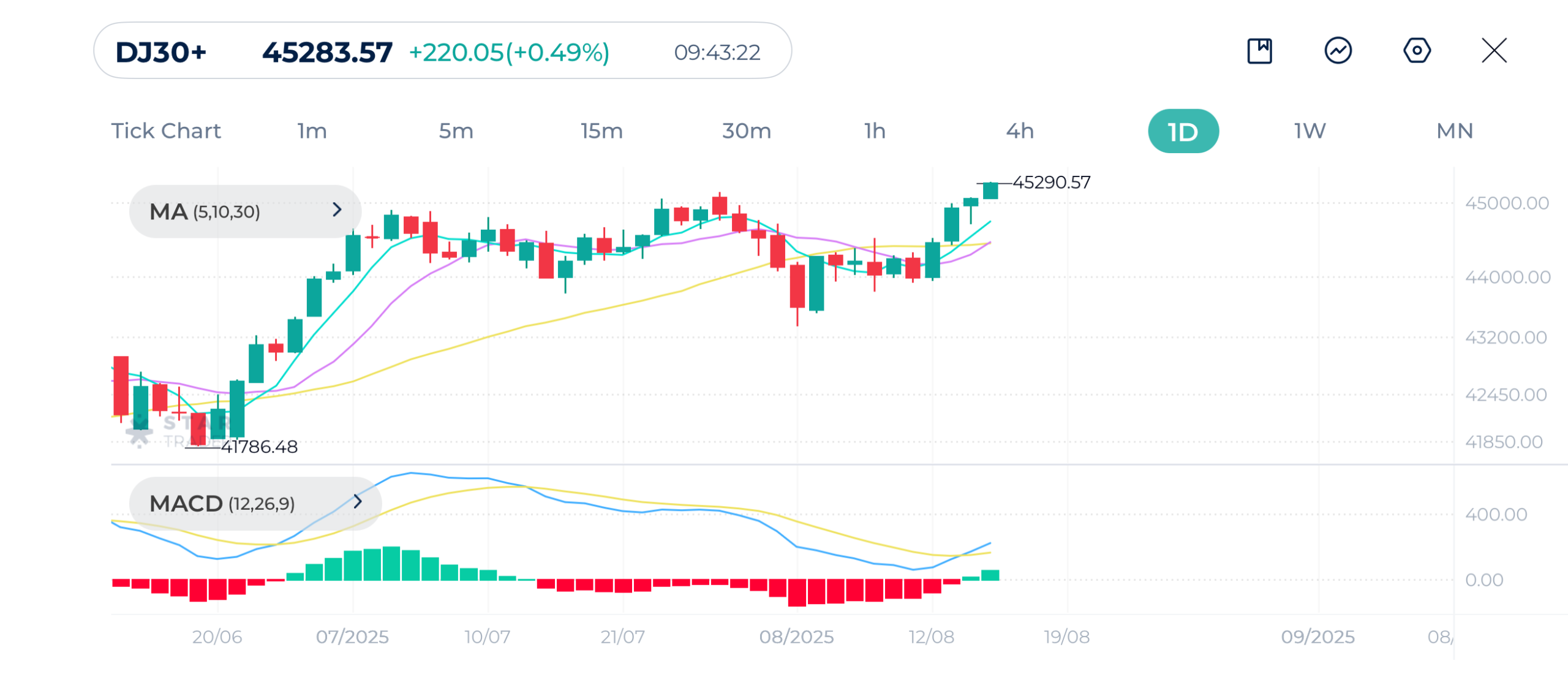 Dow Jones Industrial Average (DJ30) sustained its strong upward movement, pushing to fresh highs at 45,288 breaking above its previous record seen in December 2024. Price action remains above both the short-term and long-term moving averages, and the slope of these averages indicates sustained bullish strength. Price also found support recently at the 50-day moving average.