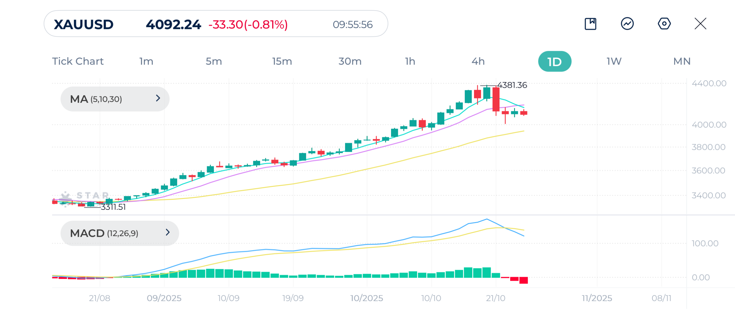 Gold remains in a strong macro uptrend, but recent price action shows the market is entering a correction phase after reaching a new high near $4,381. The strong rally has cooled, and sellers are taking profits, causing the price to pull back while still trading safely above the long-term 30-day moving average. This suggests that the broader bullish structure remains intact, even though the short-term direction has softened.