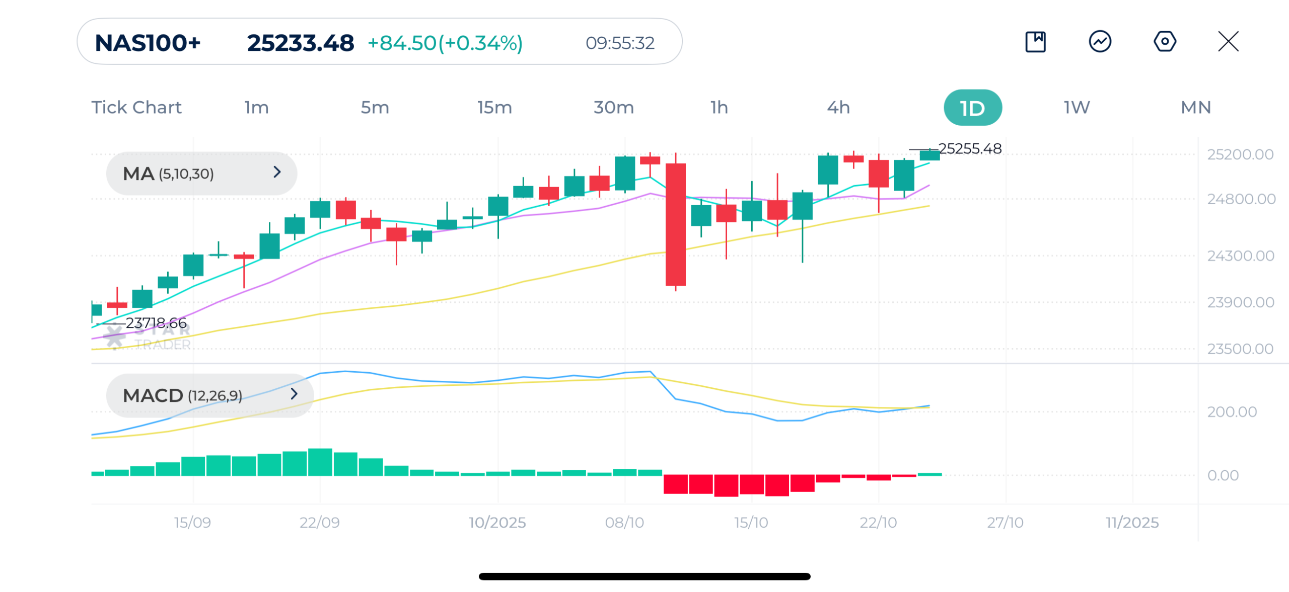 The Nasdaq 100 continues to maintain an overall bullish structure, despite experiencing a sharp downside correction recently. Buyers quickly stepped back in after the heavy red candle. Price has now recovered above the short-term moving averages again, signaling the potential restart of the upward trend.