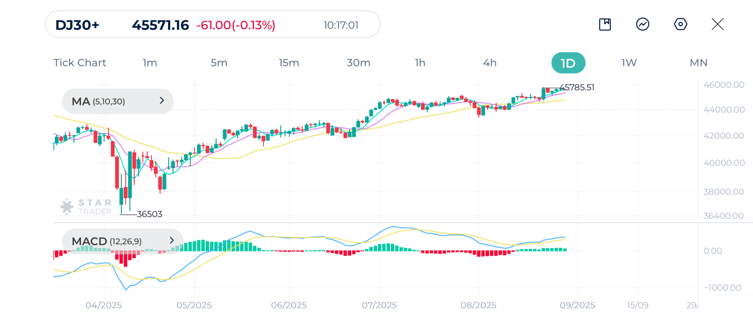 - Dow Jones broke a new record high at 45,762 following Powell’s speech